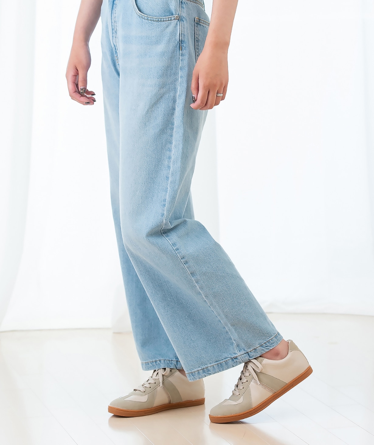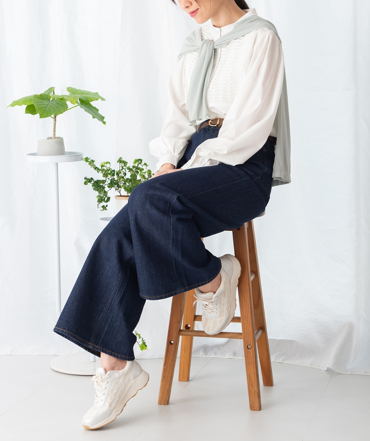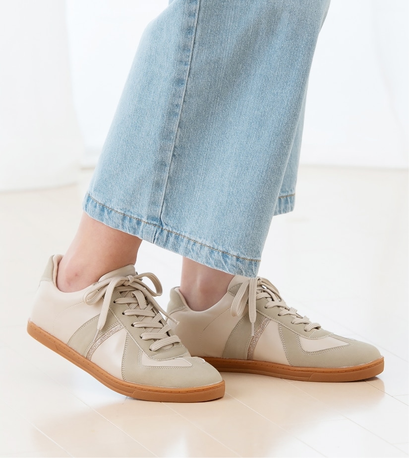 03マテリアルコンビレースアップスニーカーは、同系色の異素材コンビで仕上げたエレガントな一足。細身のトゥラインと薄めのソールが特徴で、キレイめコーデにも最適です。