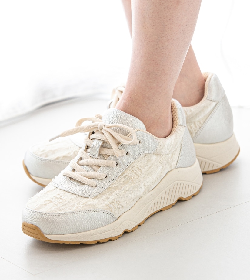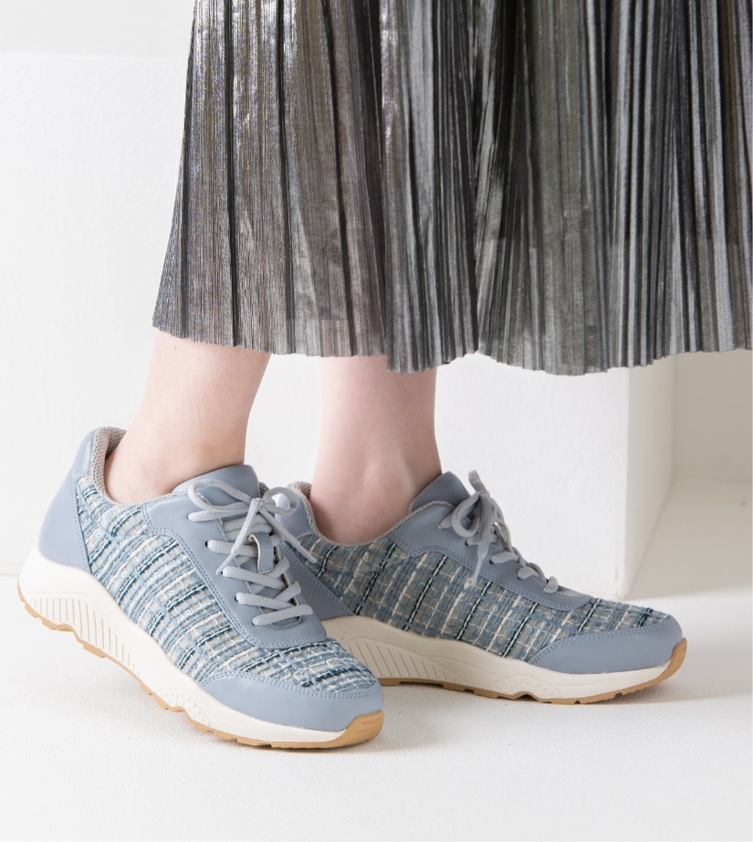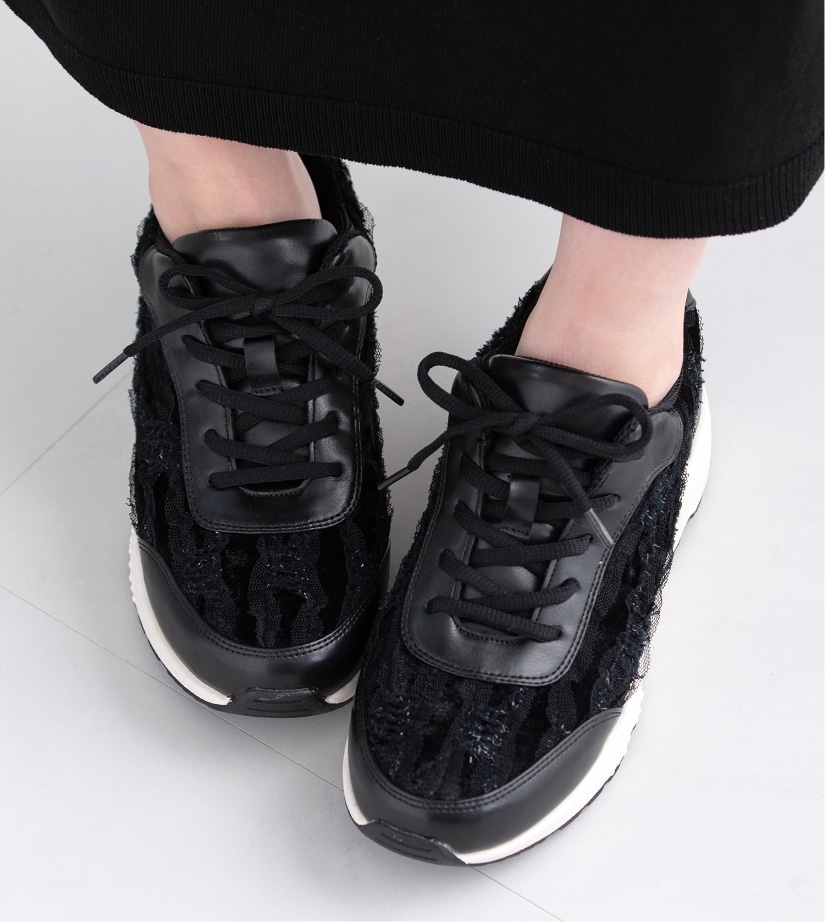 01トレンド感をプラスしたレースアップスニーカー。黒と白はベロア生地、ブルーは刺繍とスパンコールのチェック生地を使用。同系色の合皮スムースと組み合わせ、美脚効果のある実質5cmヒール仕様です。 8月下旬頃入荷予定