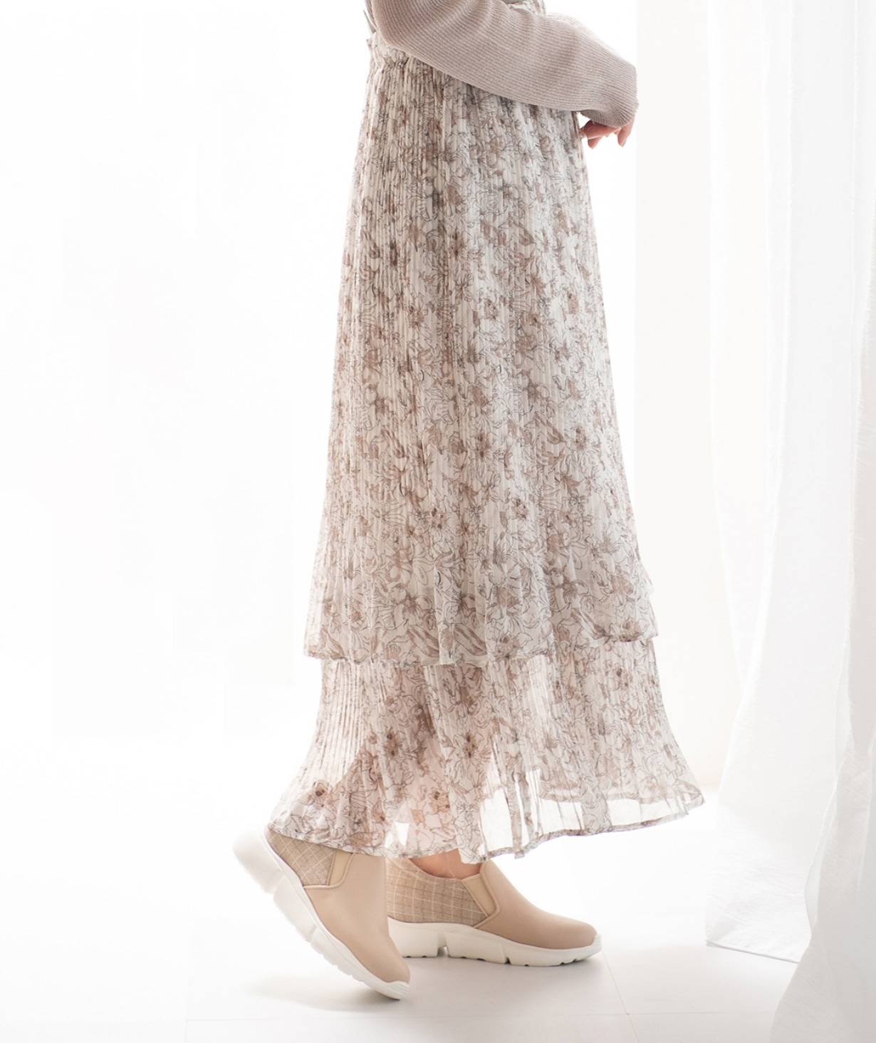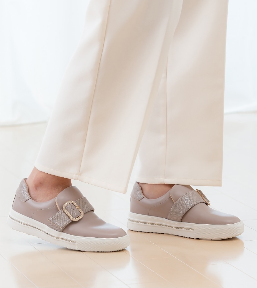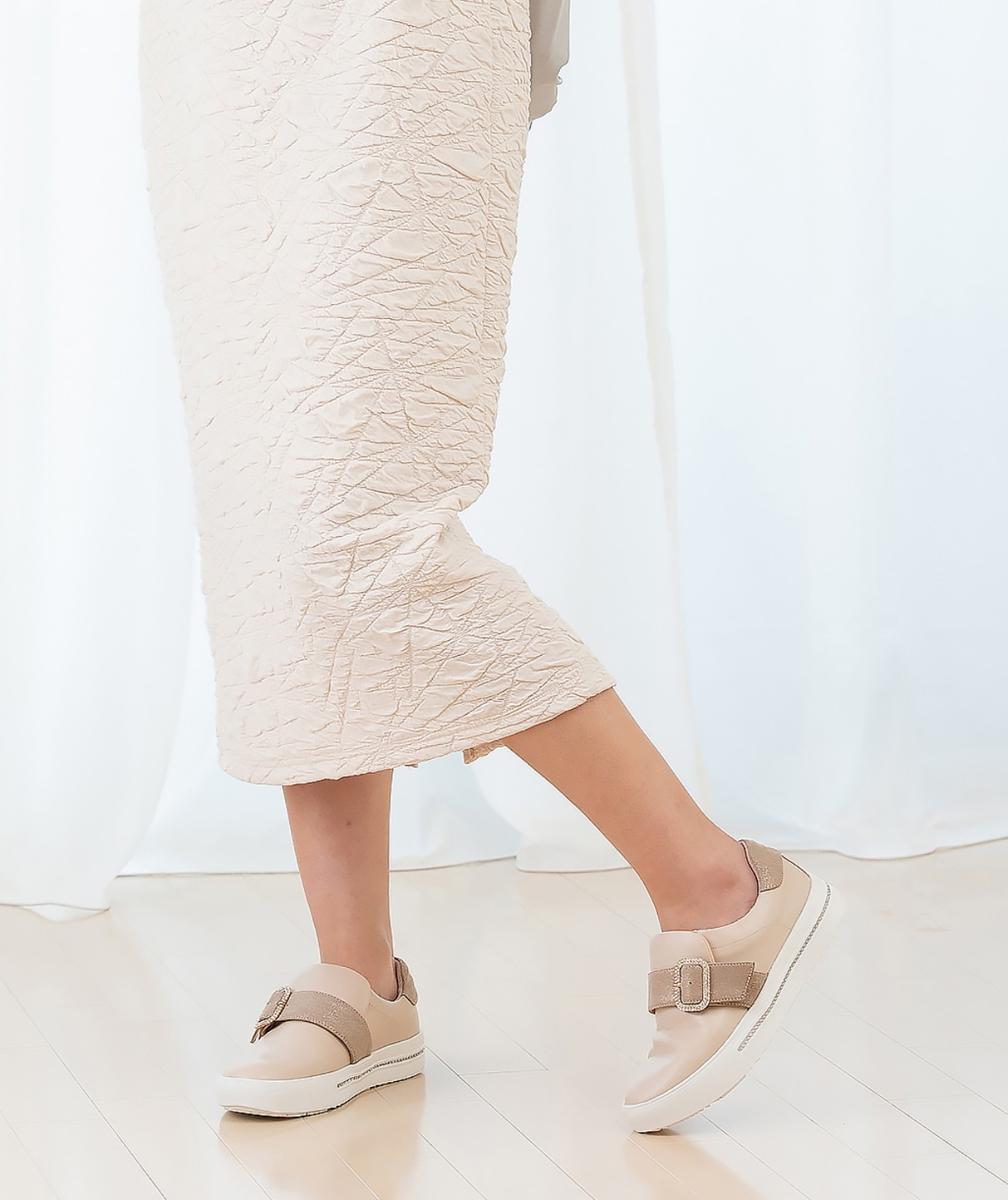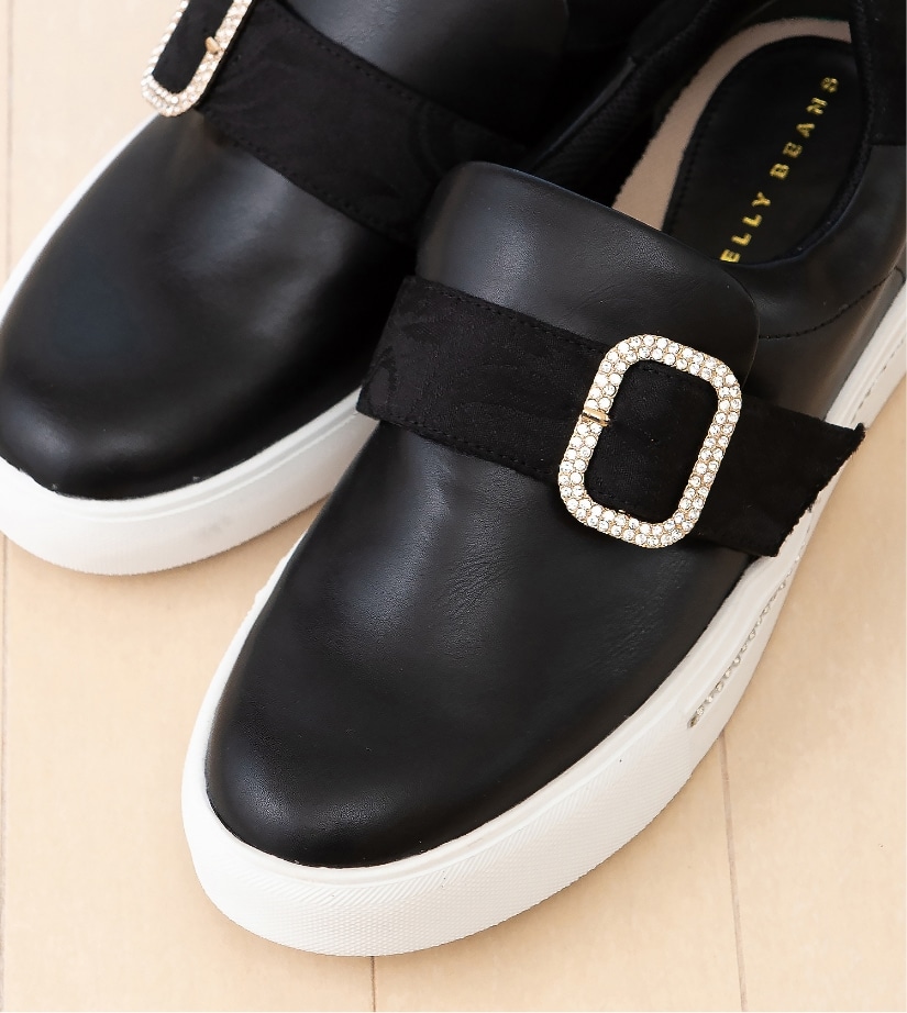 04ビジューバックルとキラキララインがアクセントのフェミニンなスリッポンスニーカー。本体とベルトは、同系色の異素材コンビの組み合わせを採用。ラクちんなのに、オシャレで高見えするアイテムです。
