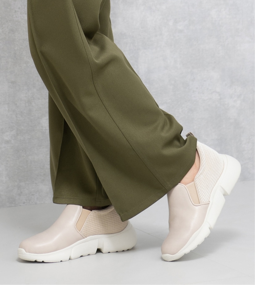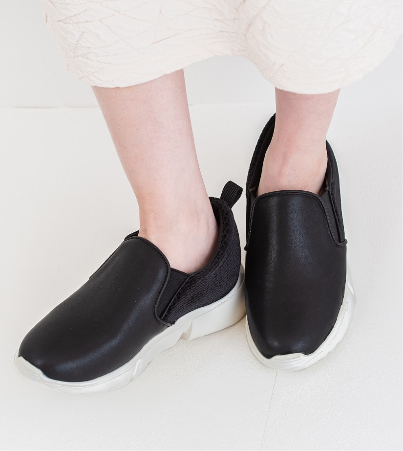 02コーデュロイ調生地と合成皮革スムースを組み合わせたスリッポンスニーカー。シンプルでスタイリングを選ばず、着脱も簡単。クッション入りのインソールで疲れにくく、美脚効果も期待できます。