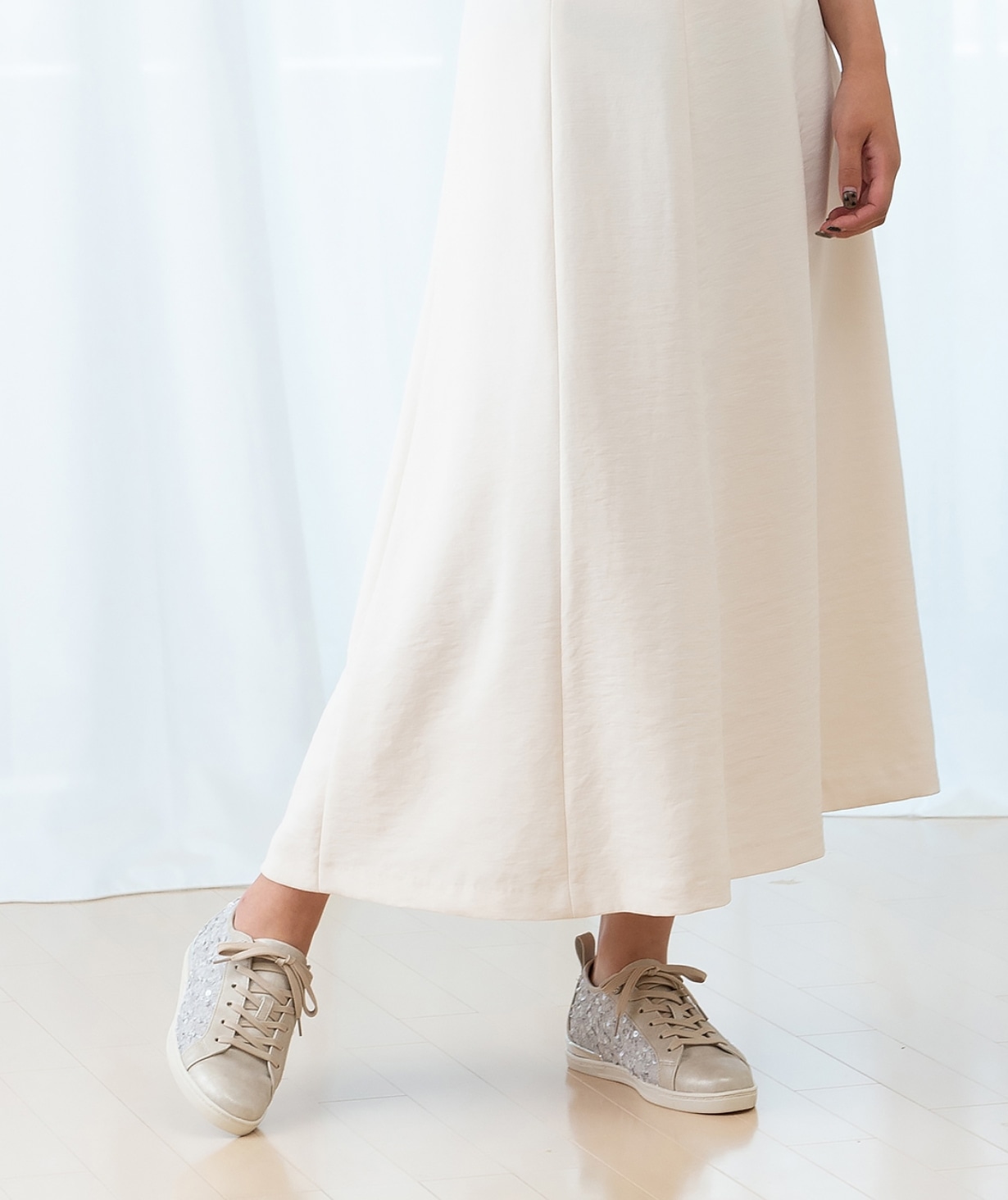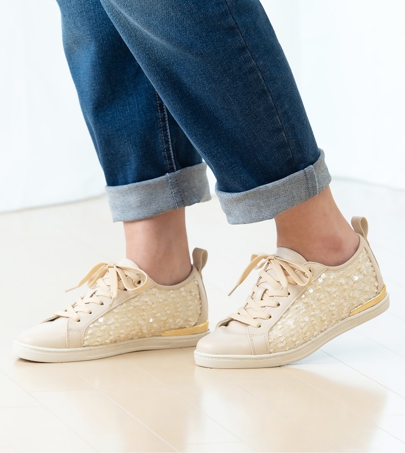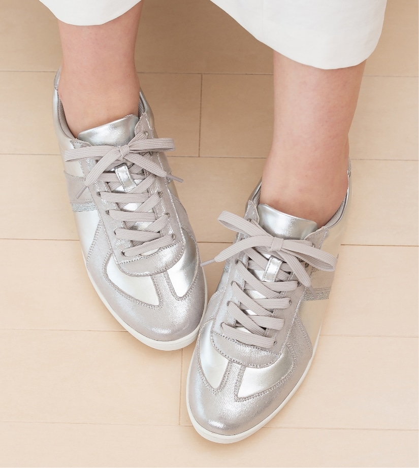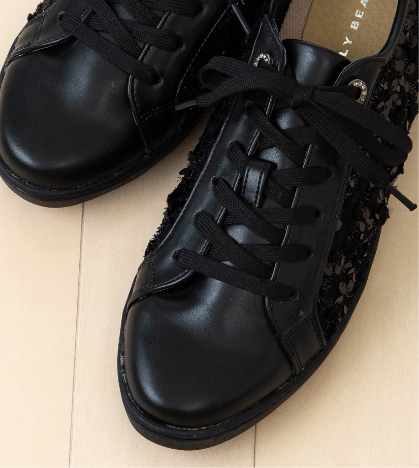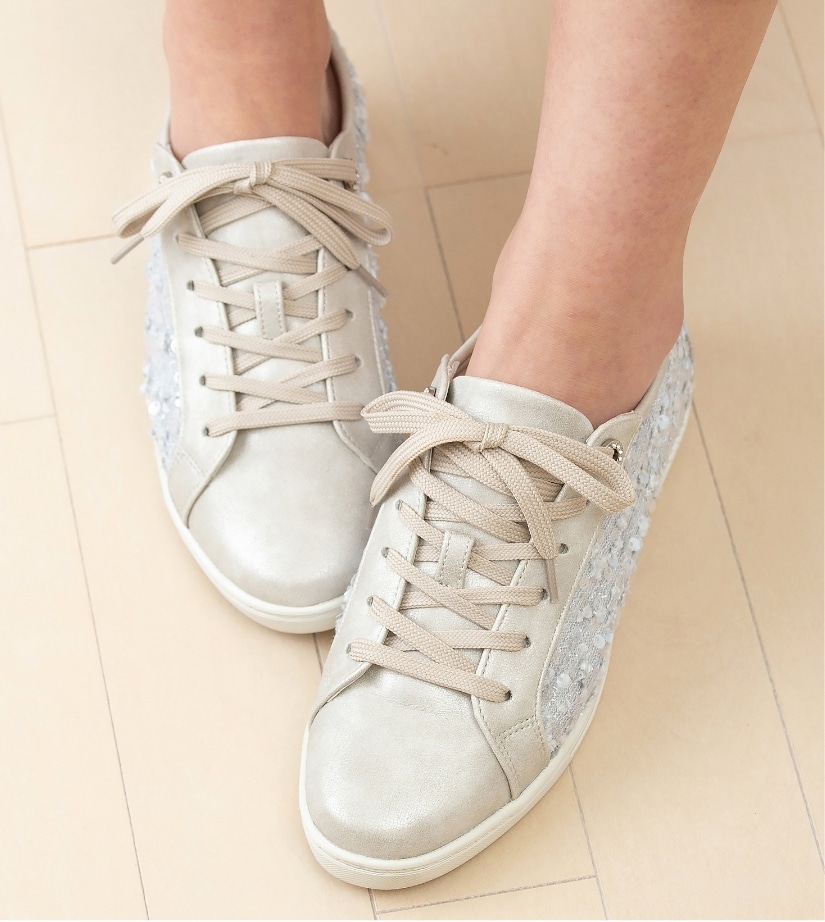 05定番人気のレースアップスニーカーにトレンドのスパンコール素材を使用し、フェミニンな印象をプラス。ラインストーンやメタルパーツのさりげないアクセントが魅力◎